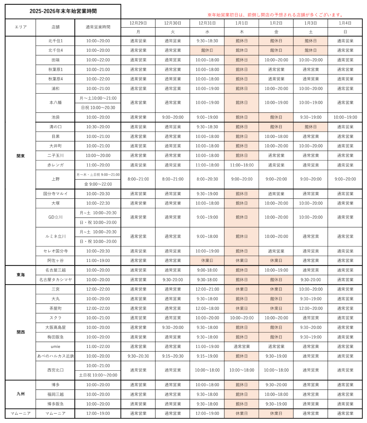 誠に勝手ながら、年末年始期間において、休業及び営業時間を変更する店舗がございます。