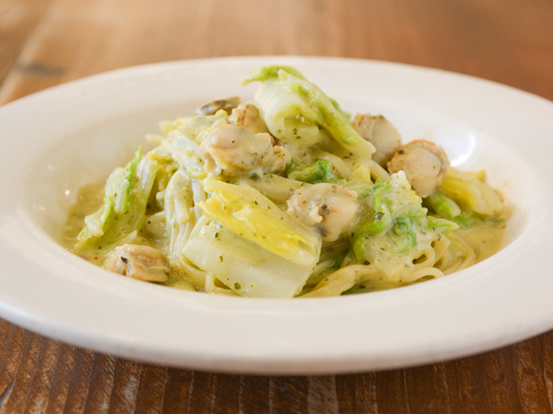 小さい貝柱と白菜をバジル風味のクリーム仕立てに。